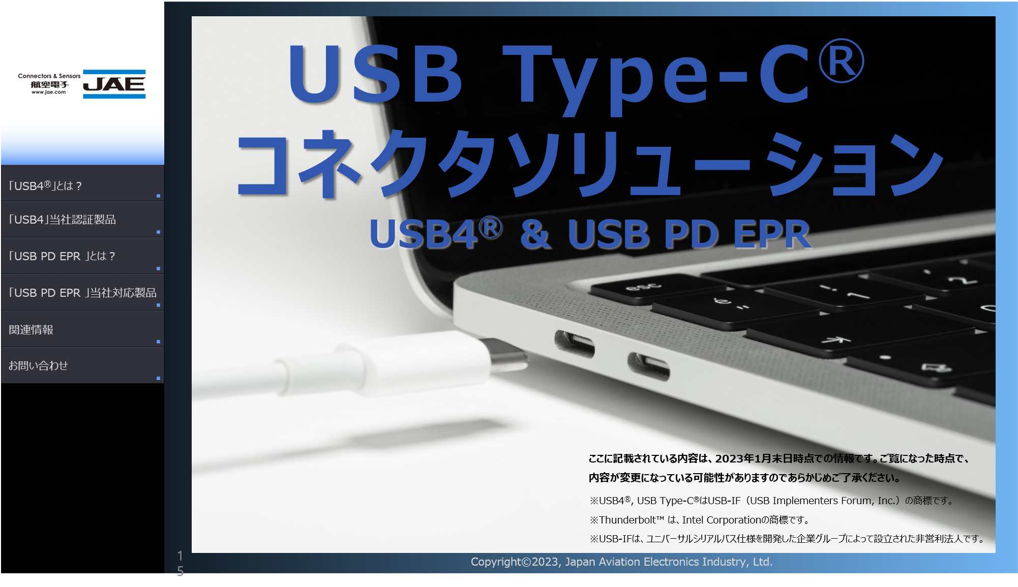 日本航空電子工業(JAE)は、USB Type-C コネクタの規格策定に当初から携わってきたコネクタメーカーとして、USB 2.0を初めPower DeliveryやUSB 3.2、Thunderbolt™3対応品をはじめ、当社の高速伝送シミュレーション技術を活用して、信号品質などに厳しいUSB4・Thunderbolt4規格の認証を取得したレセプタクルコネクタとケーブルハーネスまで、幅広い製品ラインナップを取り揃えています。